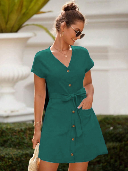 Kadın Kısa Kollu V Yakalı önden Düğmeli Belden Kuşaklı Cepli Sofya Elbise