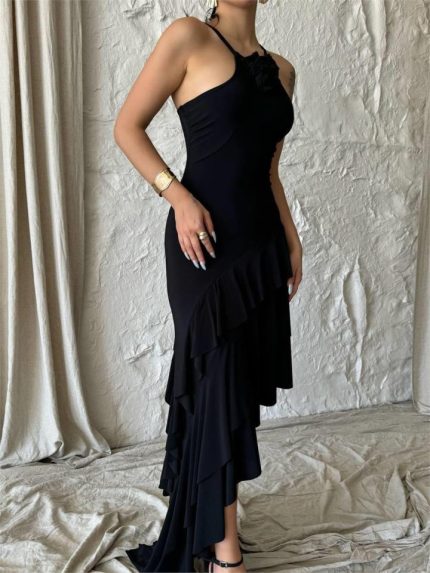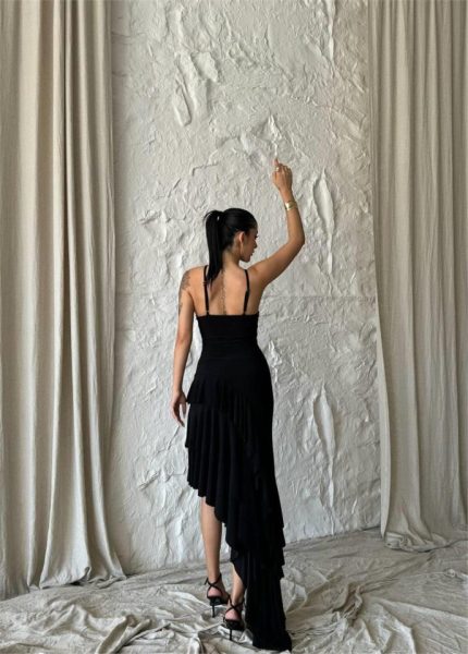 GÜLLÜ ELBİSE ASİMETRİK KATLI – Siyah