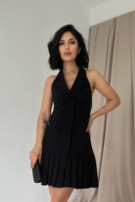 Siyah Sırtı Açık Ceket Yakalı Elbise