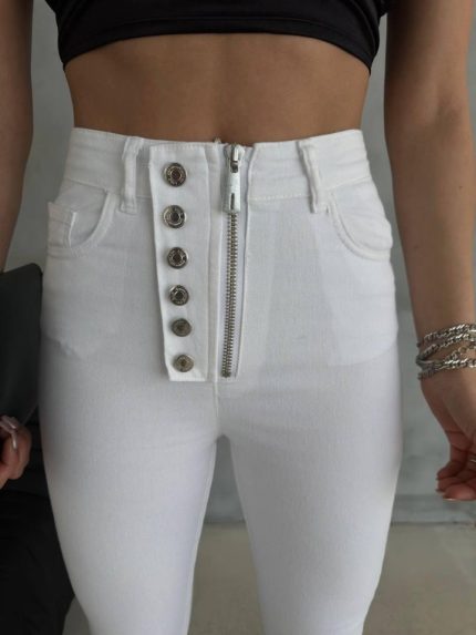 DÜĞME VE FERMUARLI KOT PANTOLON – Beyaz