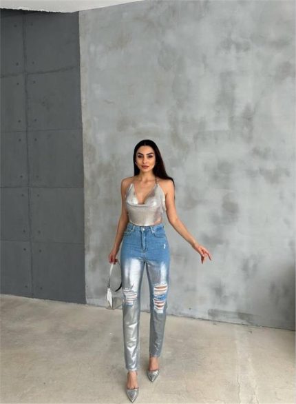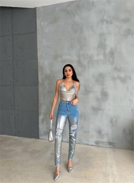 DİZ YIRTIK VARAKLI MOM KOT PANTOLON – Gümüş