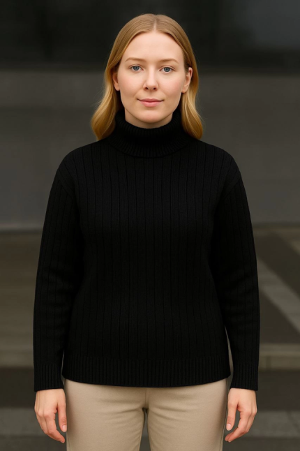 Balıkcı Yaka Bağazlı Triko Kazak Pamuklu Kalın Fitilli Dokuma – Siyah