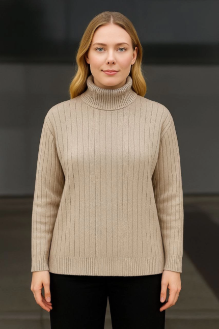 Balıkcı Yaka Bağazlı Triko Kazak Pamuklu Kalın Fitilli Dokuma – Bej