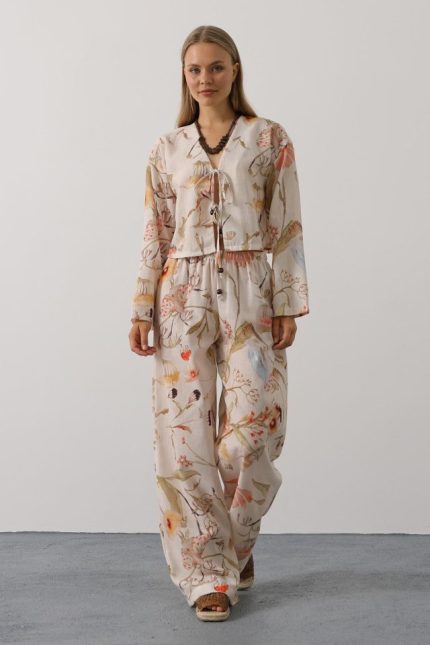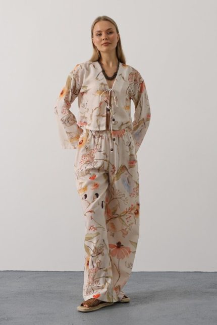 Çiçek Desen Önü Bağlamalı Pantolon Takım – Taş