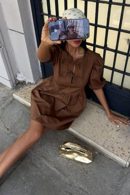 Önü Fiyonk Bağlamalı Ve Balon Kollu Elbise 2893