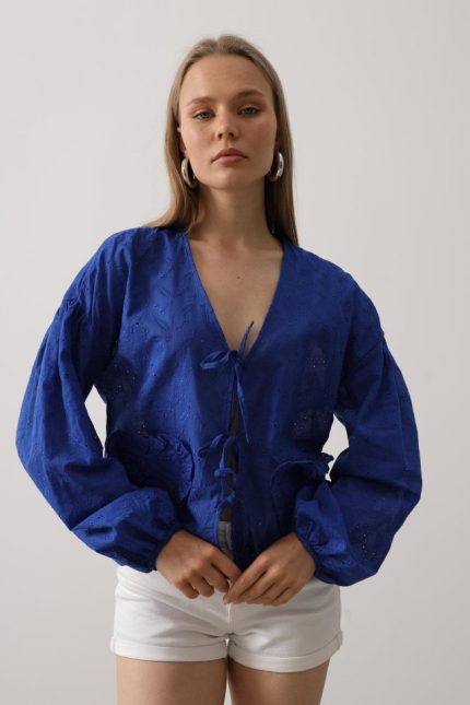 Kalp Detaylı Bağlamalı Brode Bluz – Saks