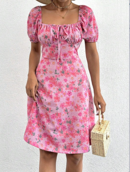 Orijinal fiyat: ₺989,90.₺890,91Şu andaki fiyat: ₺890,91.Kadın Kısa Kollu Mini çiçek Baskılı Bağcık Detay Süprem Midi Boy Elbise