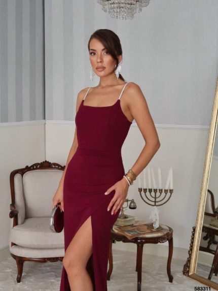 Orijinal fiyat: ₺843,65.₺759,28Şu andaki fiyat: ₺759,28.Kadın Omuz Askılı Derin Yırtmaç Detay Maxi Boy Elbise