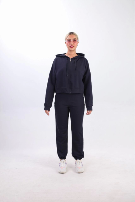 Iki Iplik Kapüşonlu Fermuarlı Crop Oversize Hırka Takım- Lacivert