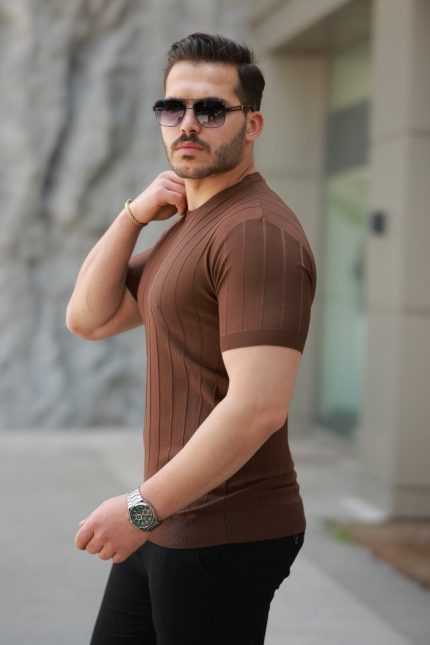Erkek Desenli çizgi Kabartmalı Kısa Kollu Tişört
