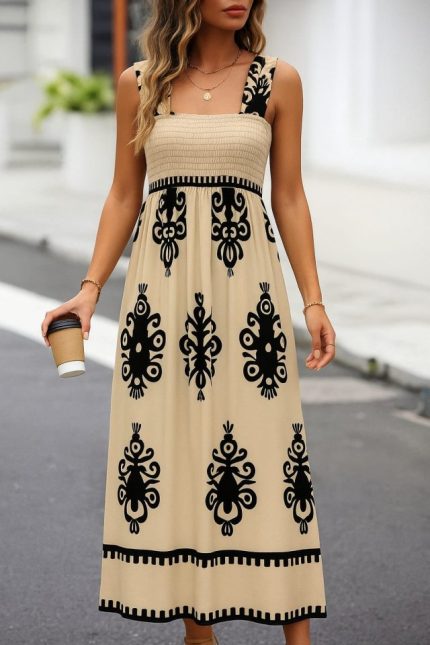 Kadın Askılı Kare Yaka Gipe Detaylı Desenli Suprem Elbise