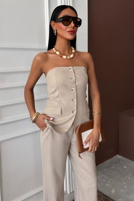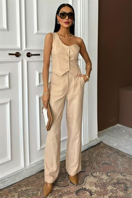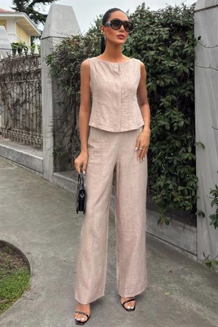Kadın Bel Büzgü Ve Düğme Detay Kapri Keten Pantolon