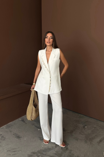 YAKA MİDYE KABUĞU SIRALI YELEK – PANTOLONTAKIM KETEN KUMAŞ – Beyaz