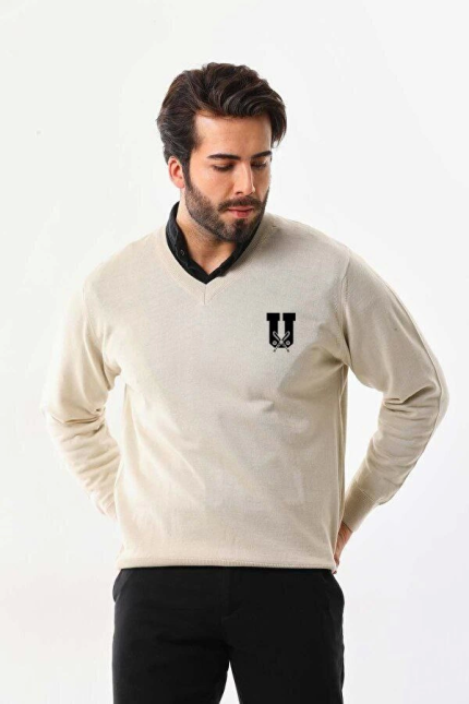Baskılı V Yaka Uzun Kol Dokuma Triko – Bej