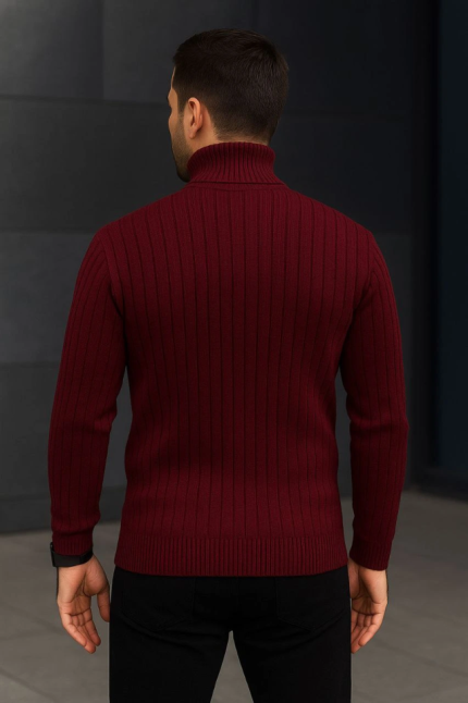 Erkek Fitilli Triko Kazak 2li Set Bordo Siyah Regular Balıkcı Yaka Tam Boğazlı Triko Seti Modeli Kazak