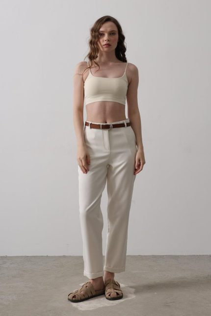 Cepli Bağlama Detaylı Keten Ekru Pantolon