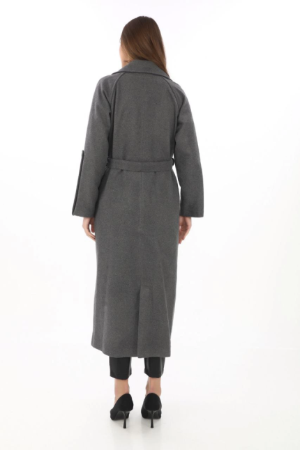 Uzun Kaşe Kaban – Yünlü Dokuma Kaşmir Kumaş, Kruvaze Yaka, Kuşaklı Astarlı Tesettür Uyumlu Şık Kışlık Siyah Model – Füme