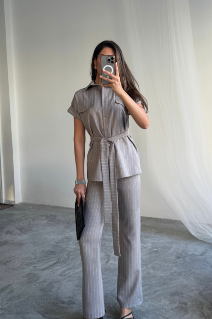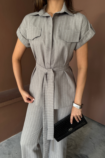 ÇİZGİLİ POLYVİSKON BLUZ – PANTOLON TAKIM – Gri