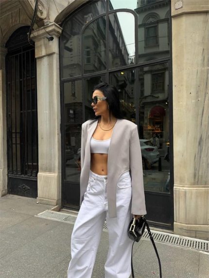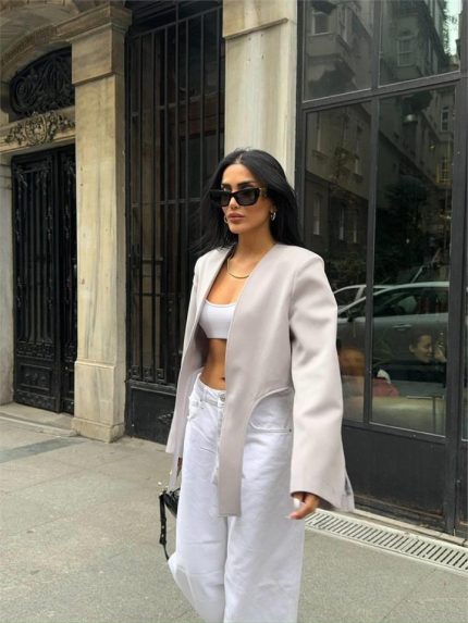 Uzun Kollu Önü İp Büzgülü Crop Ve Pantolon İkili Takım – Gri