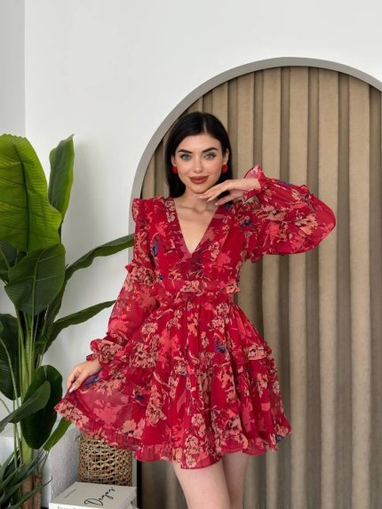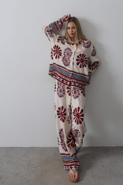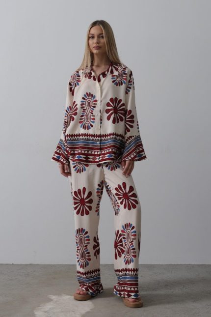 Desenli Kolları Volanlı Pantolon Takım – Kırmızı