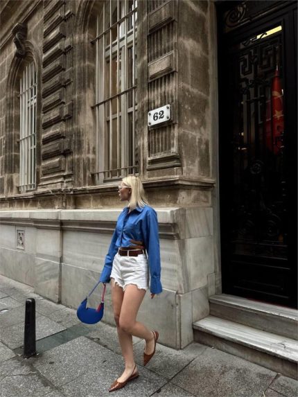 GÖMLEK POPLİN CROP YAN ÇİFT KEMER DETAYLI – Mavi