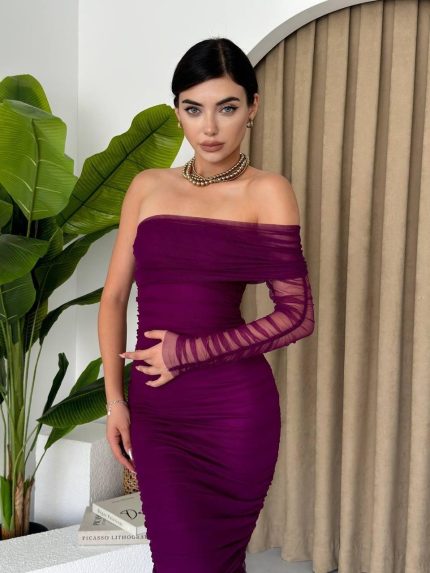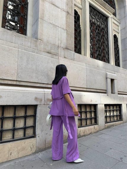 KISA KOL BAĞLAMA DETAYLI CEKET-PANTOLON TAKIM – Mor