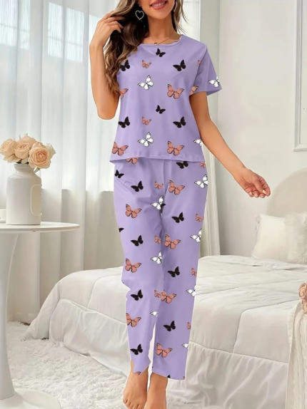 Kadın Kısa Kollu Bisiklet Yaka Kelebek Baskılı Süprem Ikili Takım