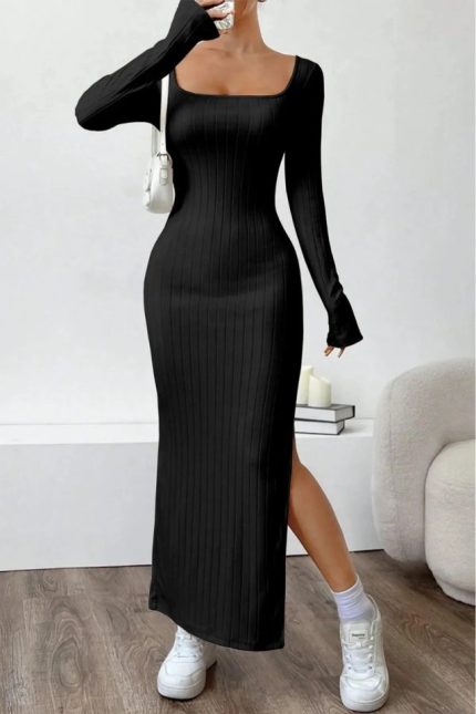 Kadın Kare Yaka Yırtmaç Detay Sırt Dekolteli Elbise