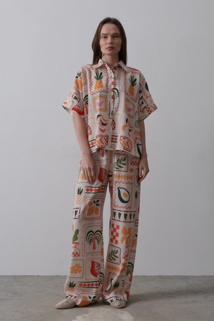 Baskılı Kısa Kol Pantolon Takım – Taş-Oranj