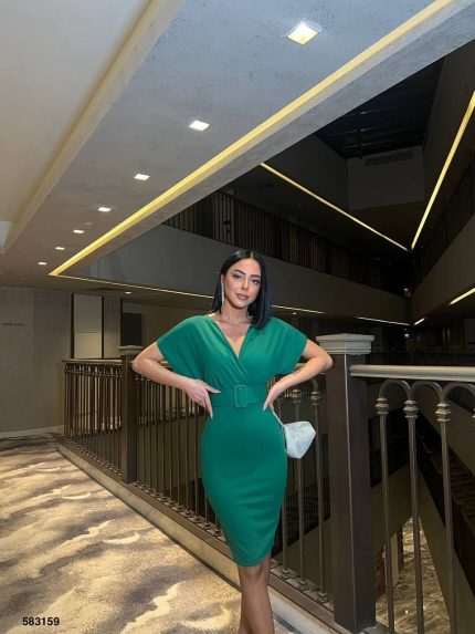 Orijinal fiyat: ₺787,40.₺708,66Şu andaki fiyat: ₺708,66.Kadın Kruvaze Yaka Midi Boy Kuşaklı Krep Elbise 120 Cm