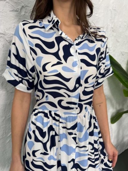 Orijinal fiyat: ₺1.319,70.₺1.187,73Şu andaki fiyat: ₺1.187,73.Baskılı Keten Elbise – Lacivert