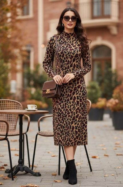 Kadın Uzun Kollu Balıkçı Yaka Leopar Desenli Midi Boy Elbise