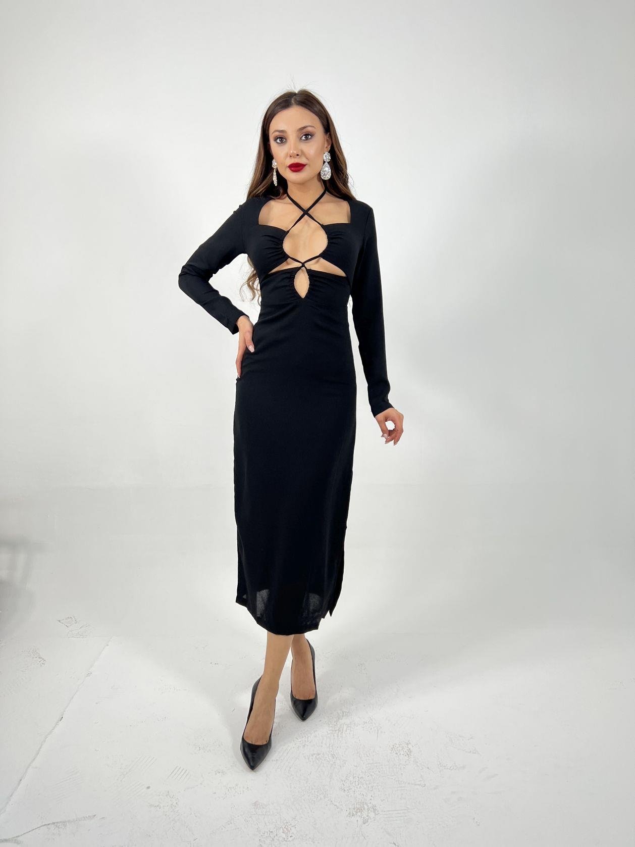 Kadın Truvakarkol Yakası Açık Blok Renkli Krep Midi Elbise