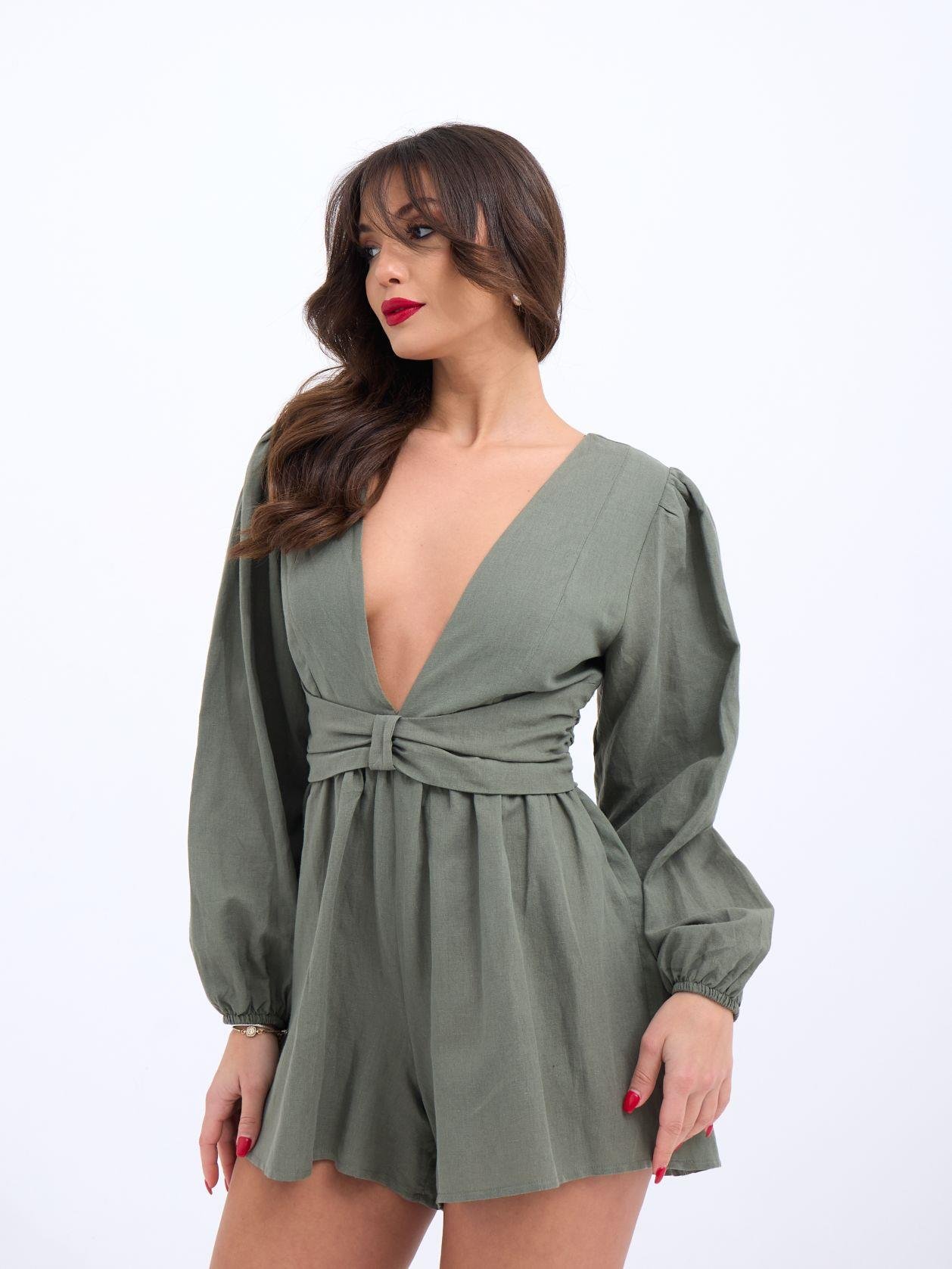 Kadın Kruvaze Yaka Dantel Güpür Ve Kuşak Detay Tulum
