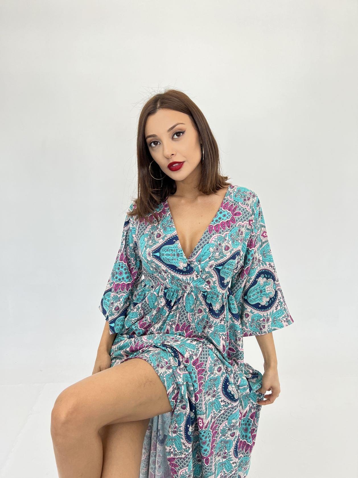 Kadın Uzun Kollu V Yakalı Yanlardan Büzgülü Kısa Sandy Elbise