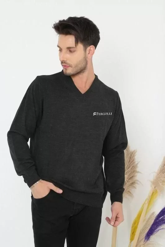 Baskılı V Yaka Uzun Kol Dokuma Triko – Füme