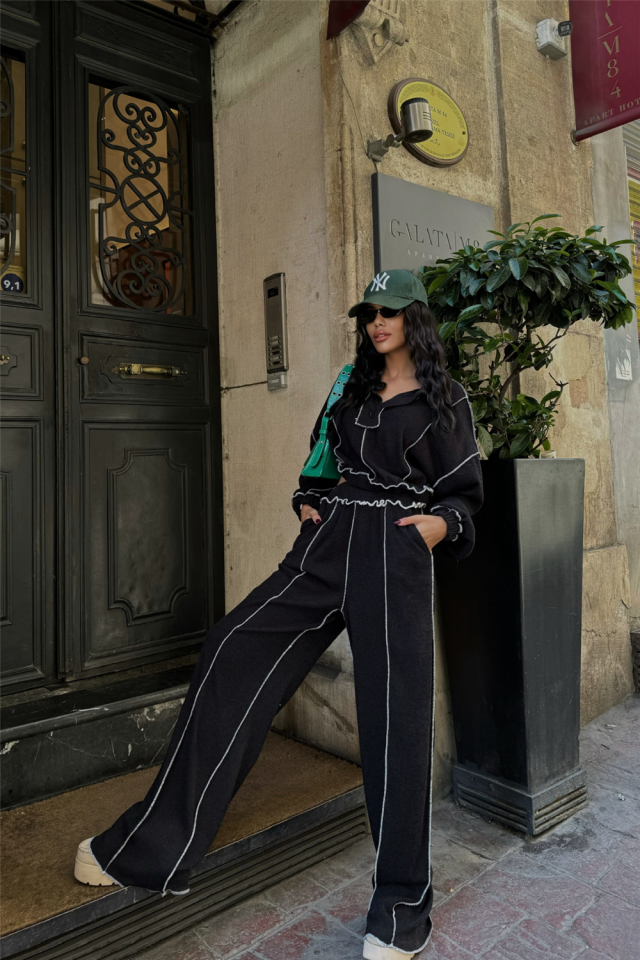 BİYELİ BLUZ PANTOLON TAKIM ŞÖNİL KUMAŞ – Siyah