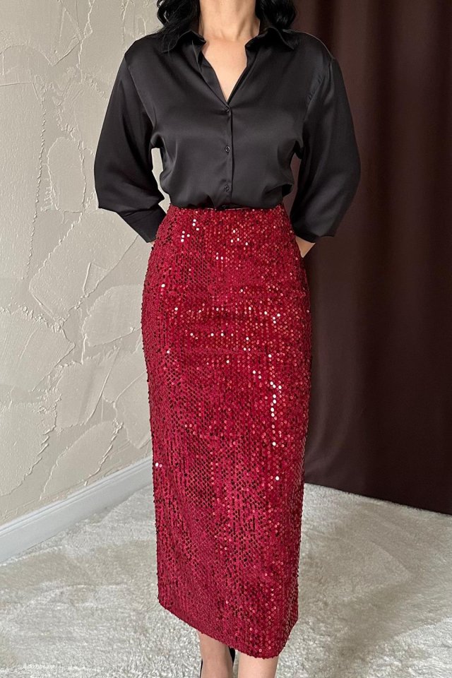 Bordo Pulpayetli Parlak Etek