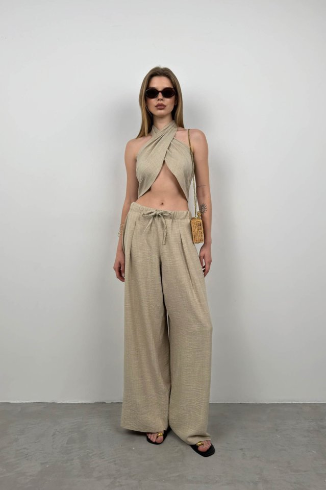 Kadın Yüksek Bel Krep Kumaş Bol Paça Pantolon