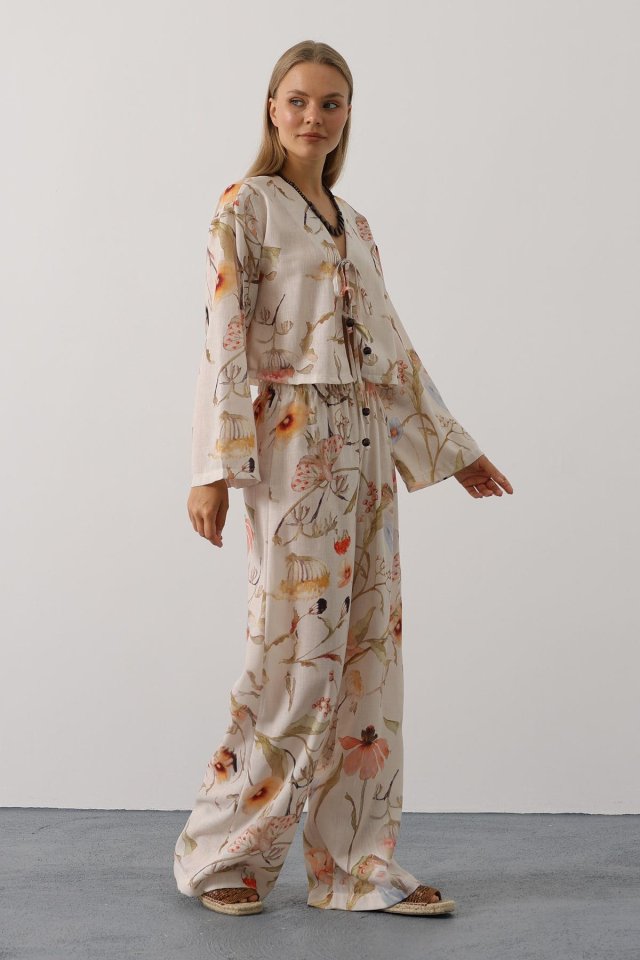 Çiçek Desen Önü Bağlamalı Pantolon Takım – Taş