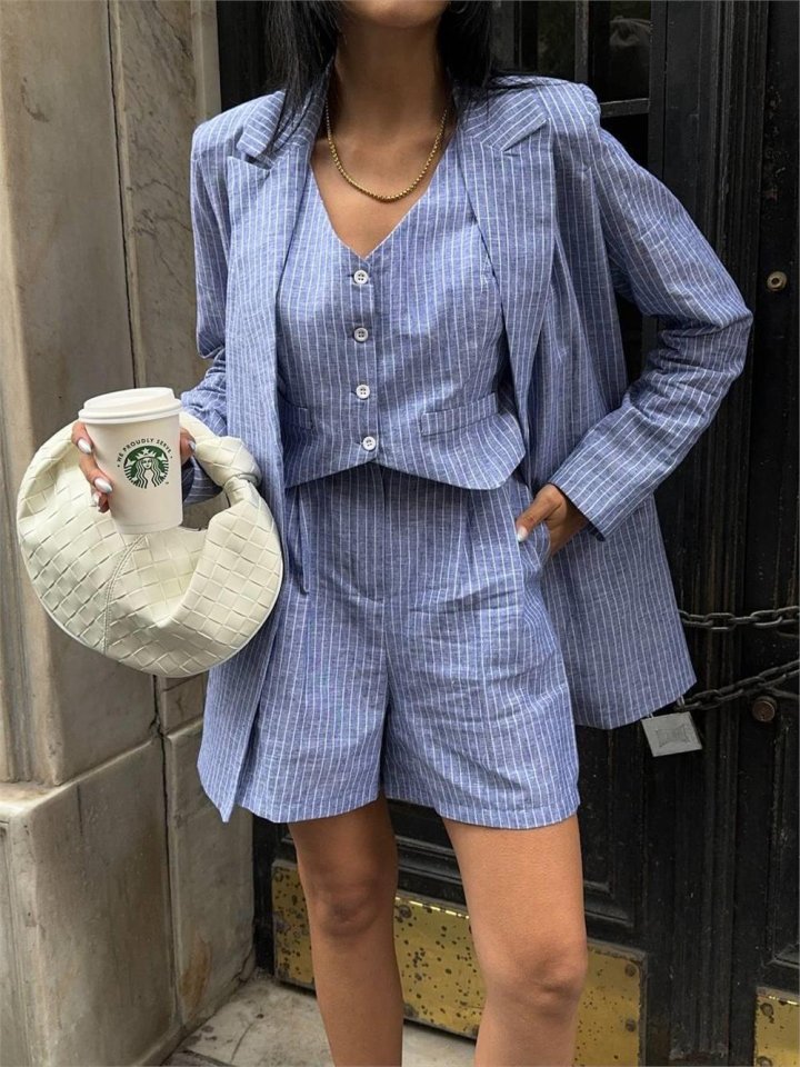 ÇİZGİLİ KETEN CEKET YELEK ŞORT TK – Mavi