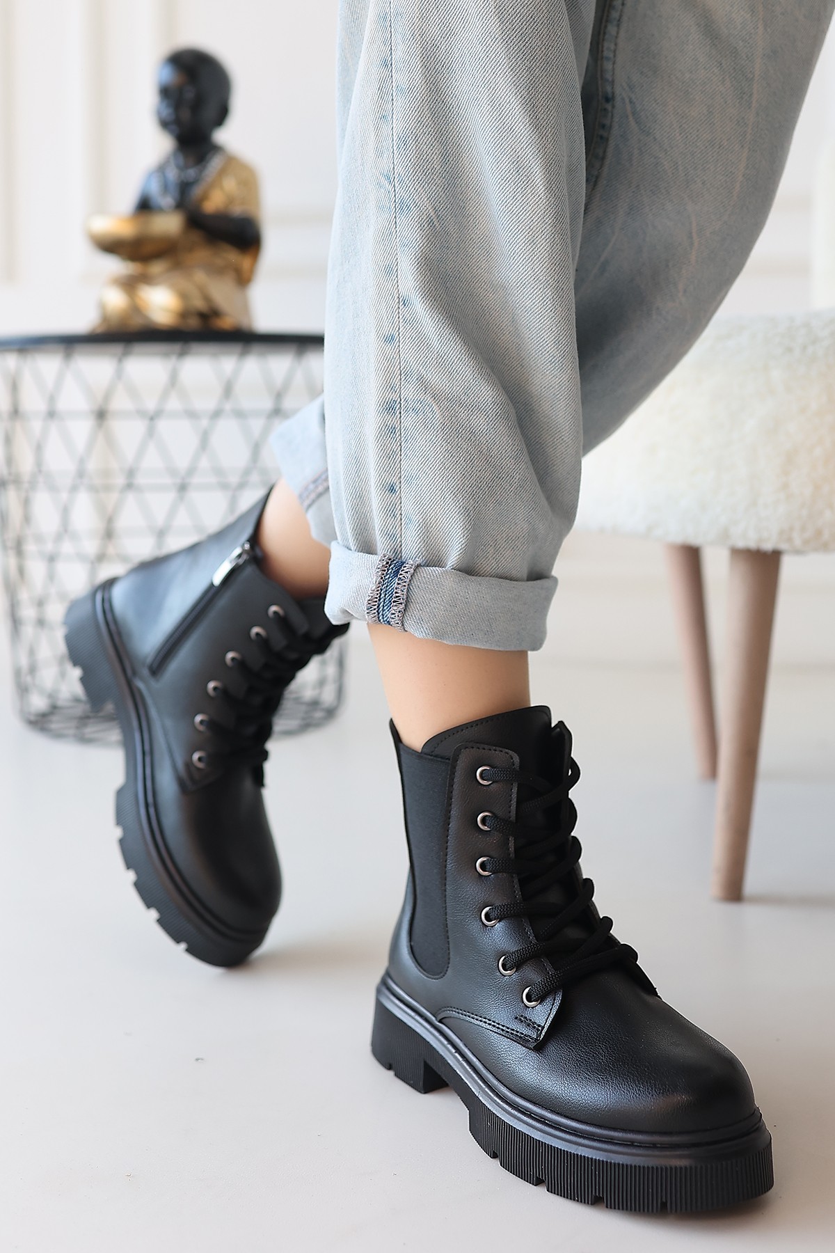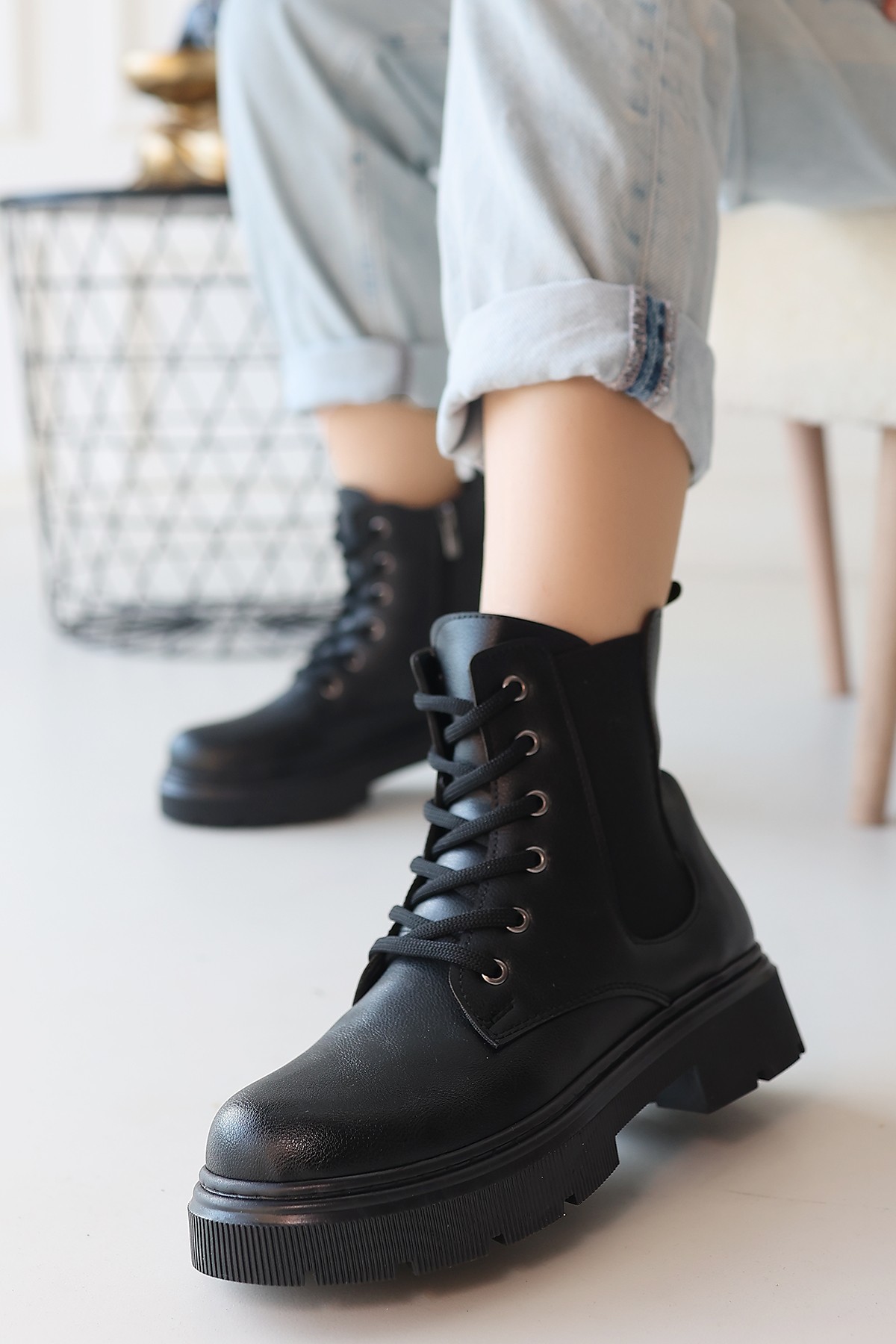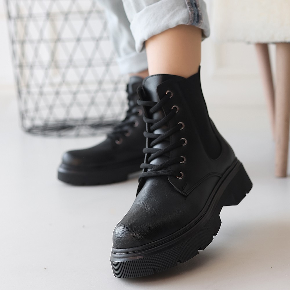 Detay : Topuklu Yandan Fermuarlı Lastikli Bağcıklı Bot