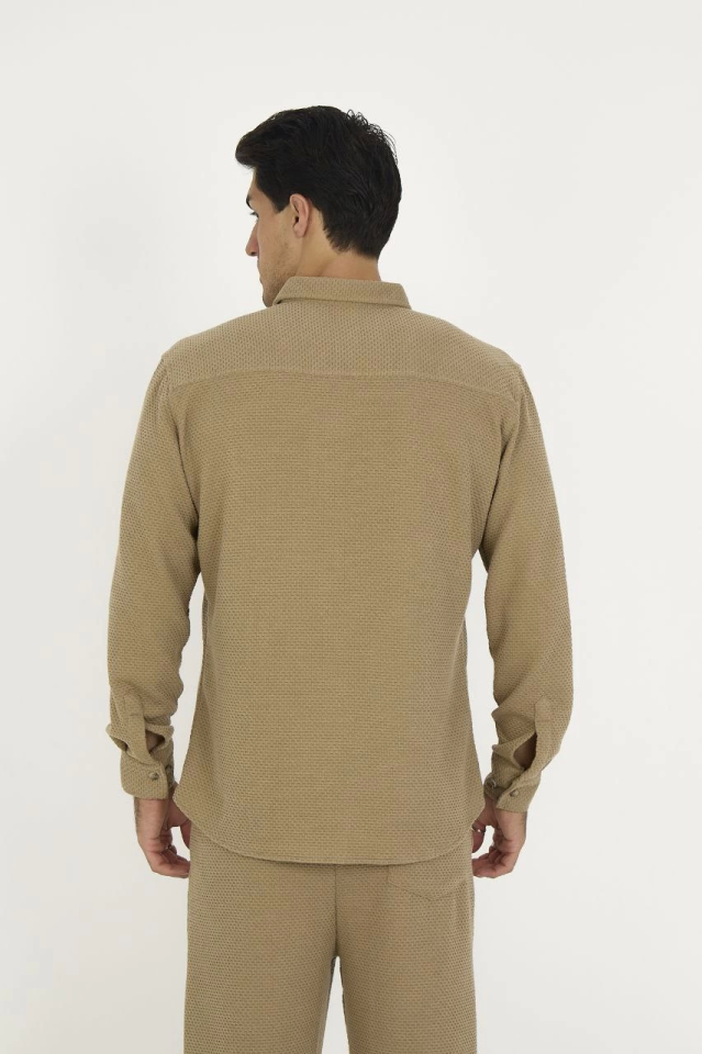 Düğmeli Tam Kalıp Uzun Kol Jakar Gömlek – Kahverengi