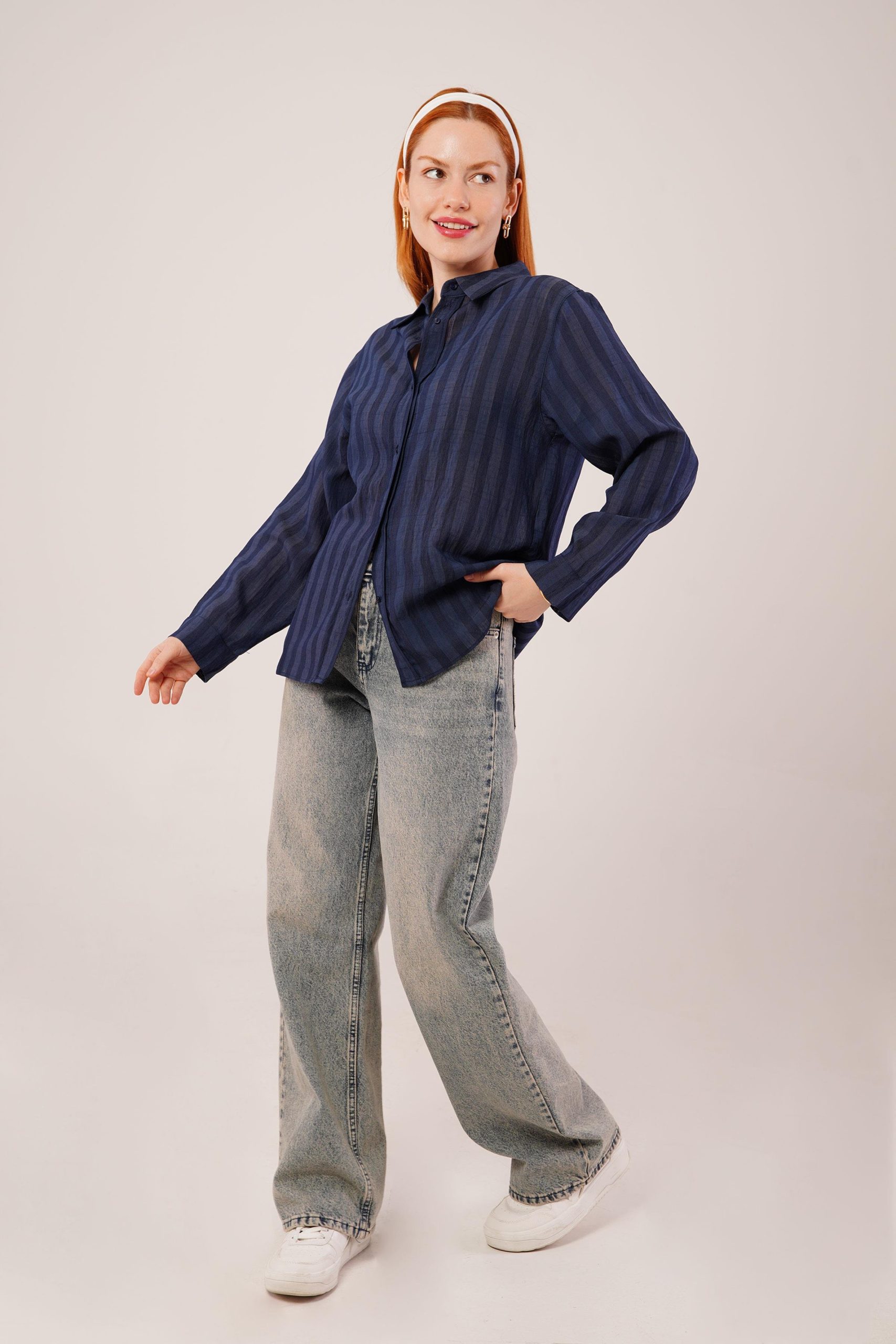 Düğmeli Ve Çizgi Detaylı Lacivert Gömlek