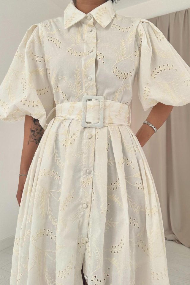 Ekru Pileli Balkon Elbise