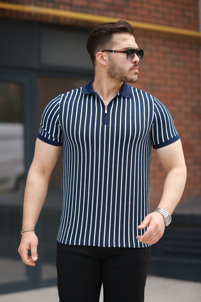 Erkek çizgili Fermuar Yakalı Kısa Kollu Tişört