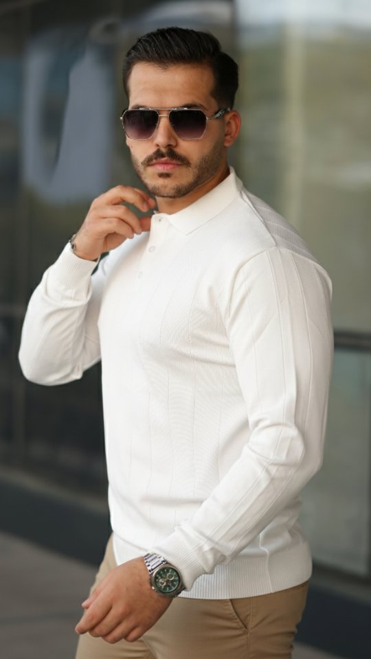 Erkek Düğmeli Yaka çizgi Dokulu Uzun Kollu Triko