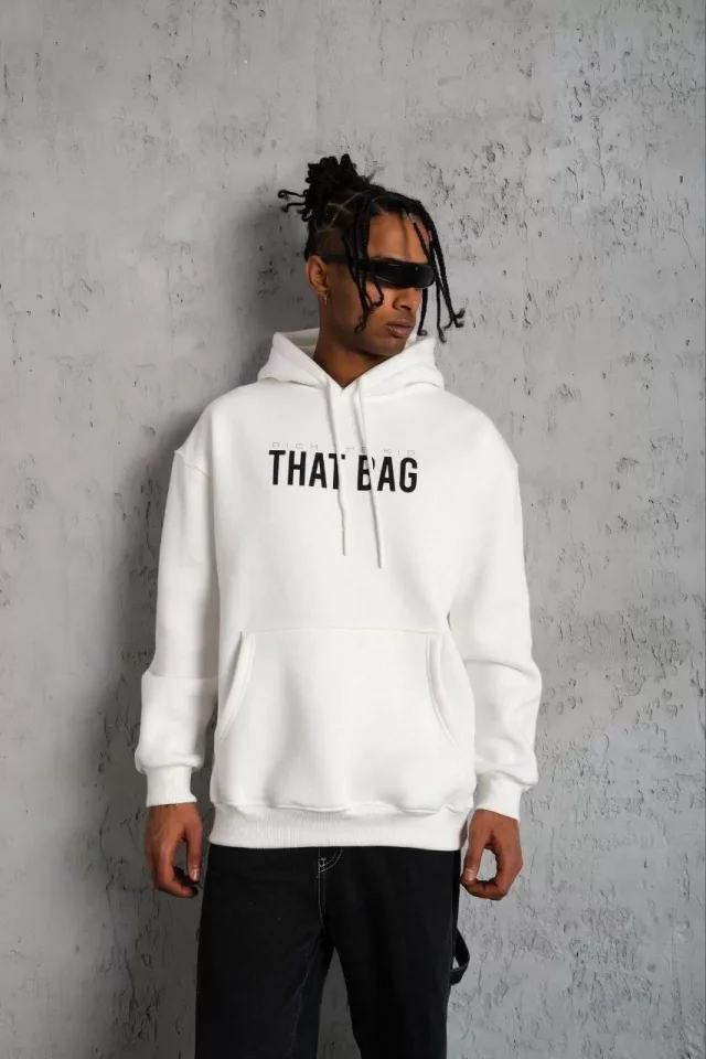 Erkek Kanguru Cep Baskılı Kapüşonlu Sweatshirt – Beyaz