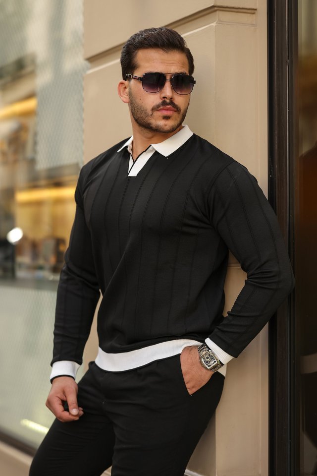 Erkek Renkli Yaka Manşet Uzun Kollu Triko