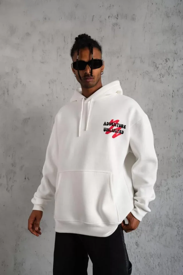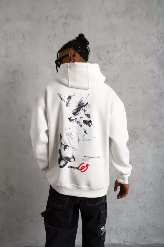 Erkek Şapkalı Güvercin Baskılı Kapşonlu Sweat – Beyaz